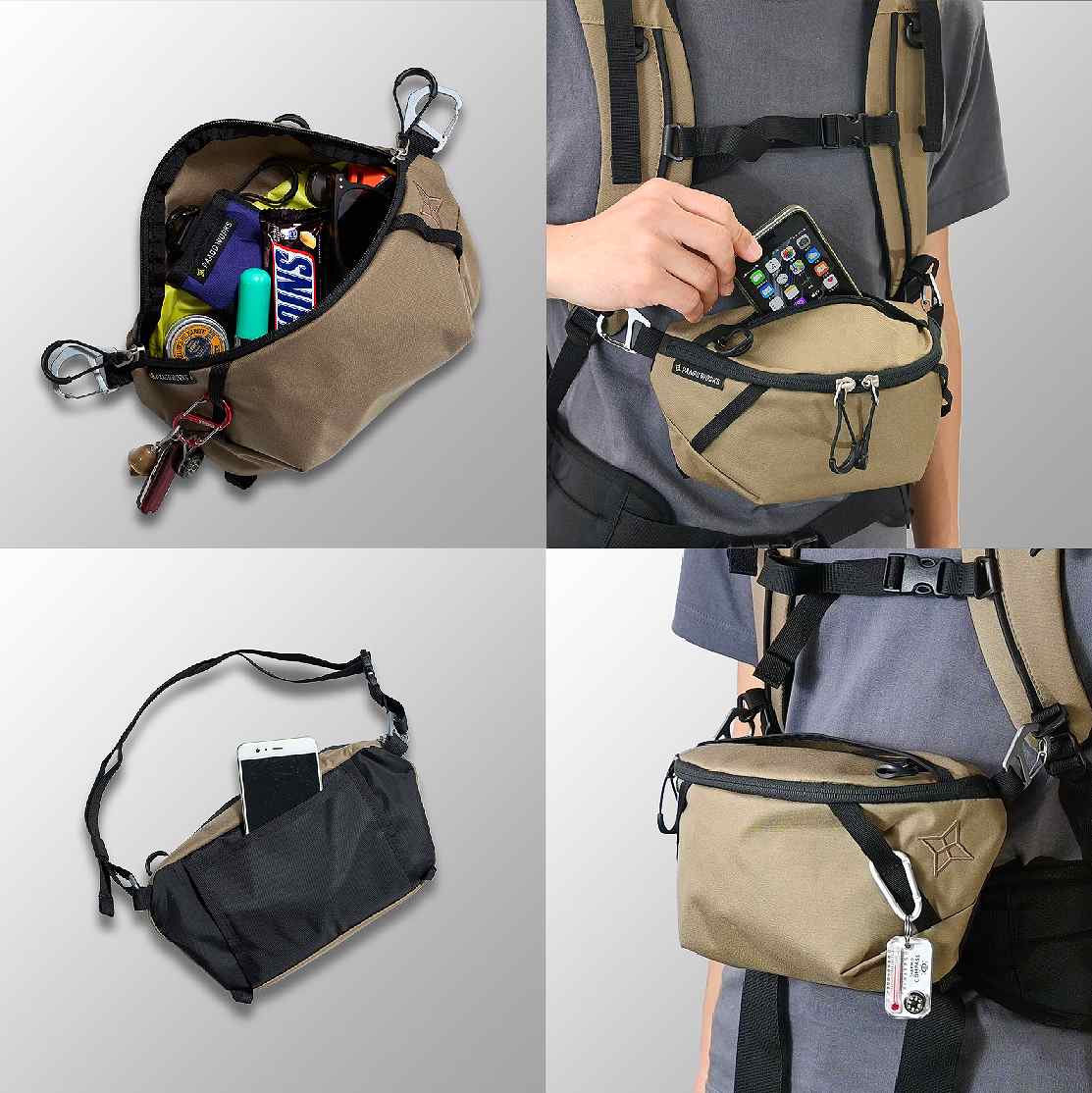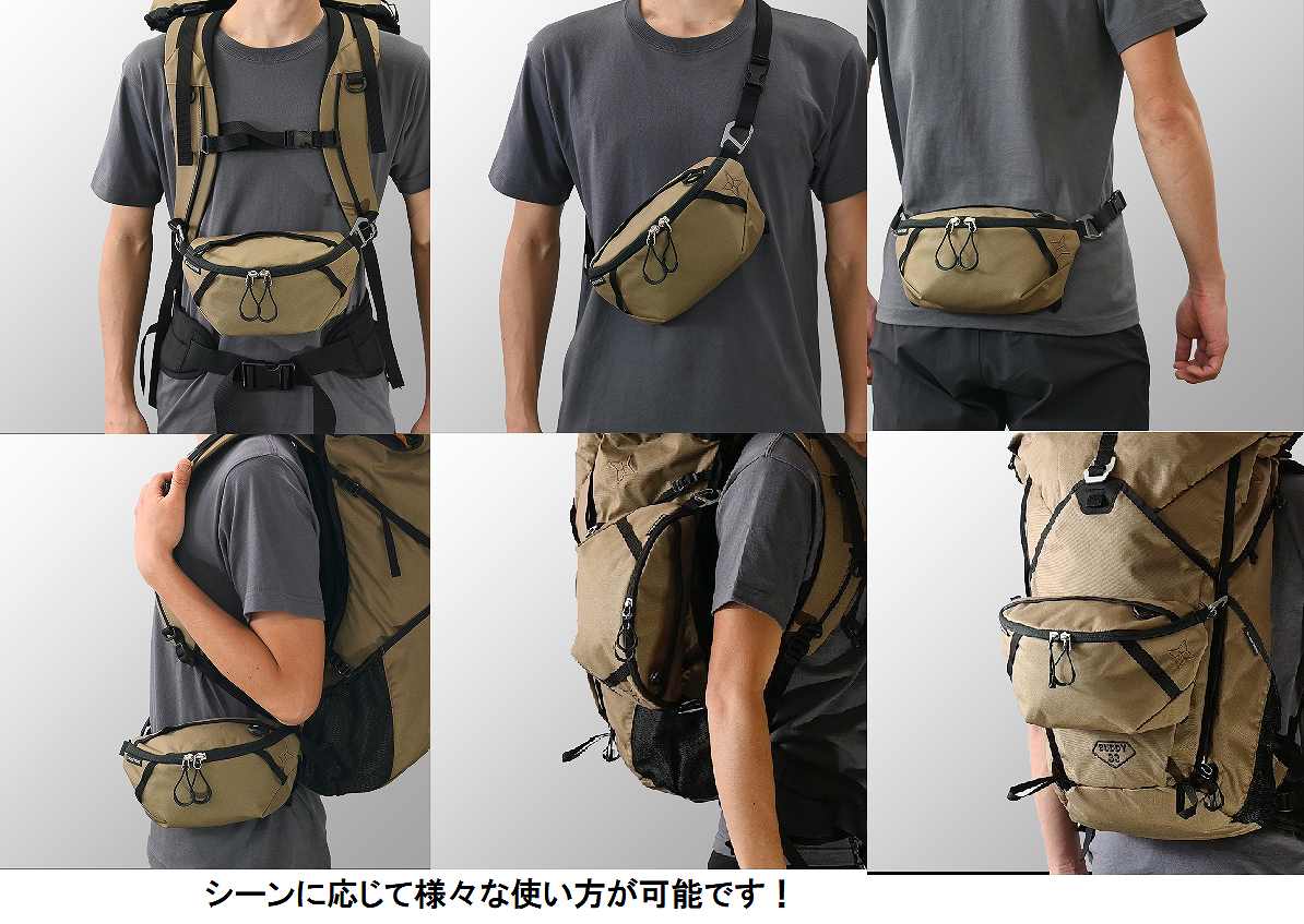 チェストバッグ、ショルダーバッグ、ウエストバッグ、サイドポケット、アウターポケット