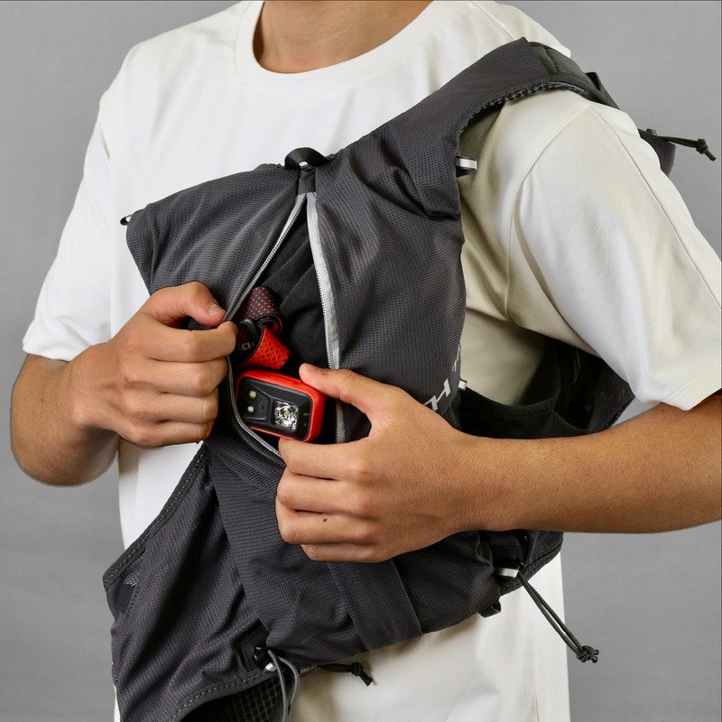 ドローコード付きの下段ポケットはジェルや行動食の収納に適しています。
