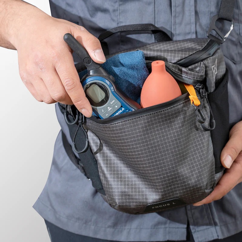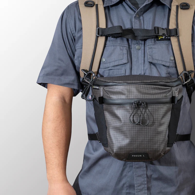 行動中はチェストバッグとして使うと、カメラの重量を分散し肩への負担を軽減できます。(画像はLサイズ)