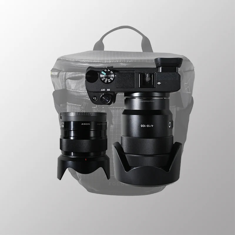 APS-Cサイズのミラーレスカメラと標準ズームレンズやコンパクトな単焦点レンズの収納が可能。