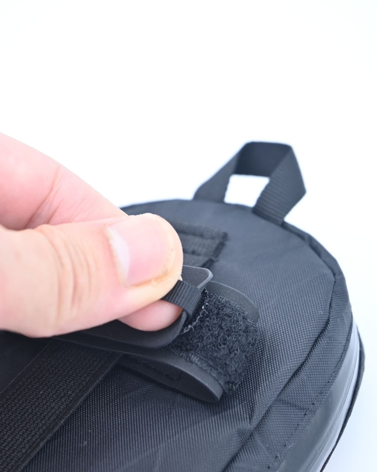 ショルダーハーネスへの固定は、マジックテープ付きのテープ2本と、上部のストッパーを使用して行えます。外周19cmまでのショルダーハーネスに対応するよう設計されています。