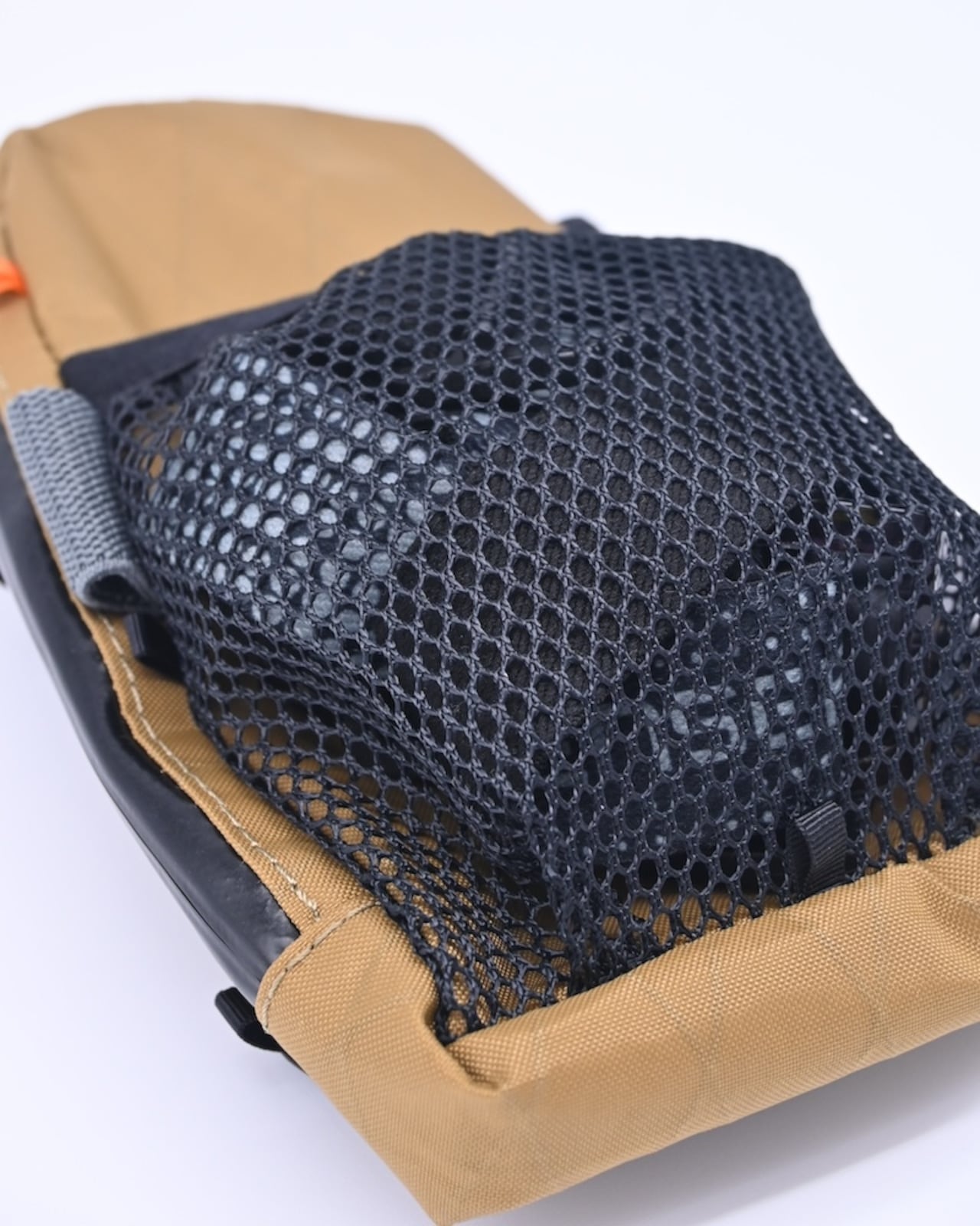 外側にはメッシュポケットはマチがついているので、スマホ、厚みのあるヘッドライトや複数の行動食を収納することができます。