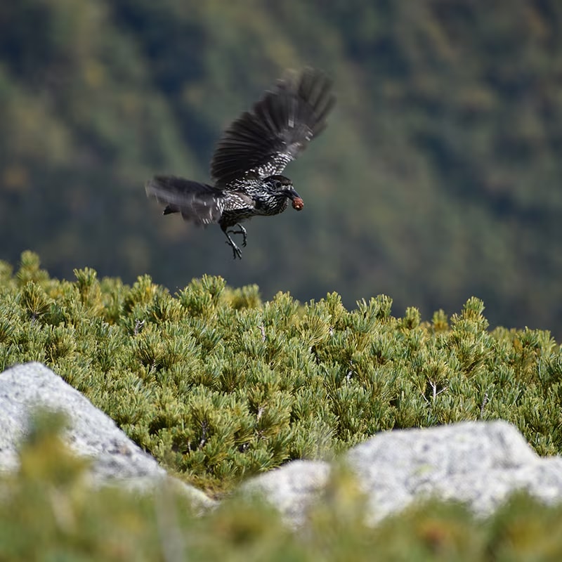 高山の森に住むカラスの仲間で、全身の白い斑点が満点の星空に似てることから名付けられたホシガラス。